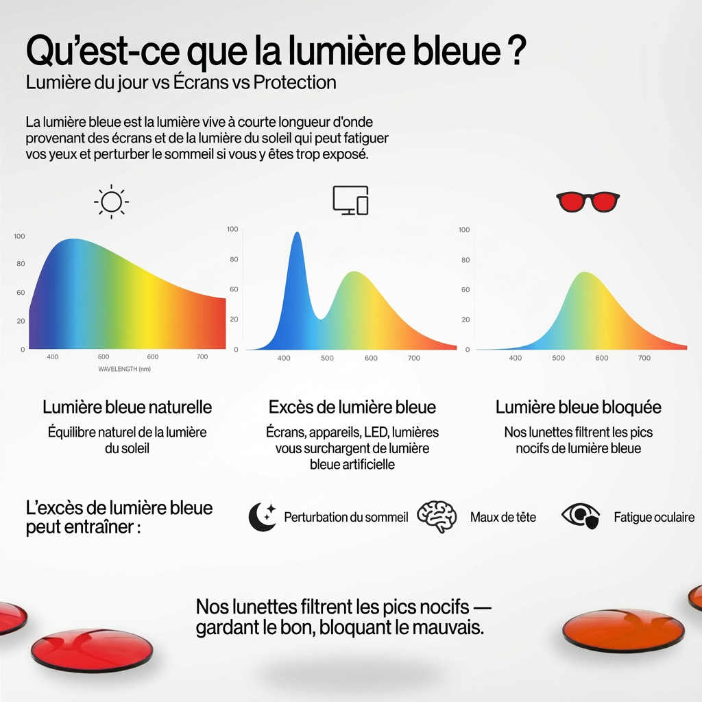 Nos lunettes bloquent jusqu’à 99 % de la lumière bleue à haute énergie (longueurs d’onde comprises entre 400 et 495 nm) et de la lumière verte (environ 495 à 520 nm), principalement émises par les éclairages artificiels. L’exposition à ces longueurs d’onde le soir diminue fortement la production de mélatonine, l’hormone qui signale à votre corps qu’il est temps de dormir. En bloquant cette lumière, les lunettes contribuent à maintenir votre rythme circadien, permettant ainsi à votre corps de reconnaître les signaux naturels du sommeil, de s’endormir plus facilement et de profiter d’un sommeil plus profond et réparateur.